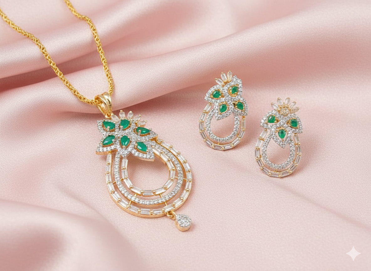 This exquisite choker set is designed for red-carpet elegance. It features a flexible, curved gold-plated necklace base meticulously pavé-set with shimmering white American Diamonds in a stylized leaf arrangement. The focal point is a large, vibrant cushion-cut stone—available in clear crystal for classic brilliance or ruby red for a bold statement. The set includes matching earrings that echo the central pendant’s regal design