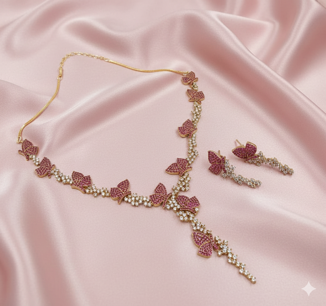 AD Mehndi Polish Pink Butterfly Necklace Set