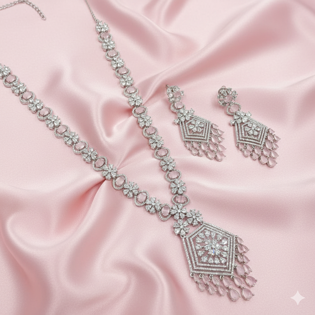 Add subtle elegance to your jewellery collection with this beautifully crafted AD Silver Finish Blush Pink Pendant Set. Designed in a premium silver finish, this set is enhanced with shimmering white AD crystals that add brilliance and sophistication.