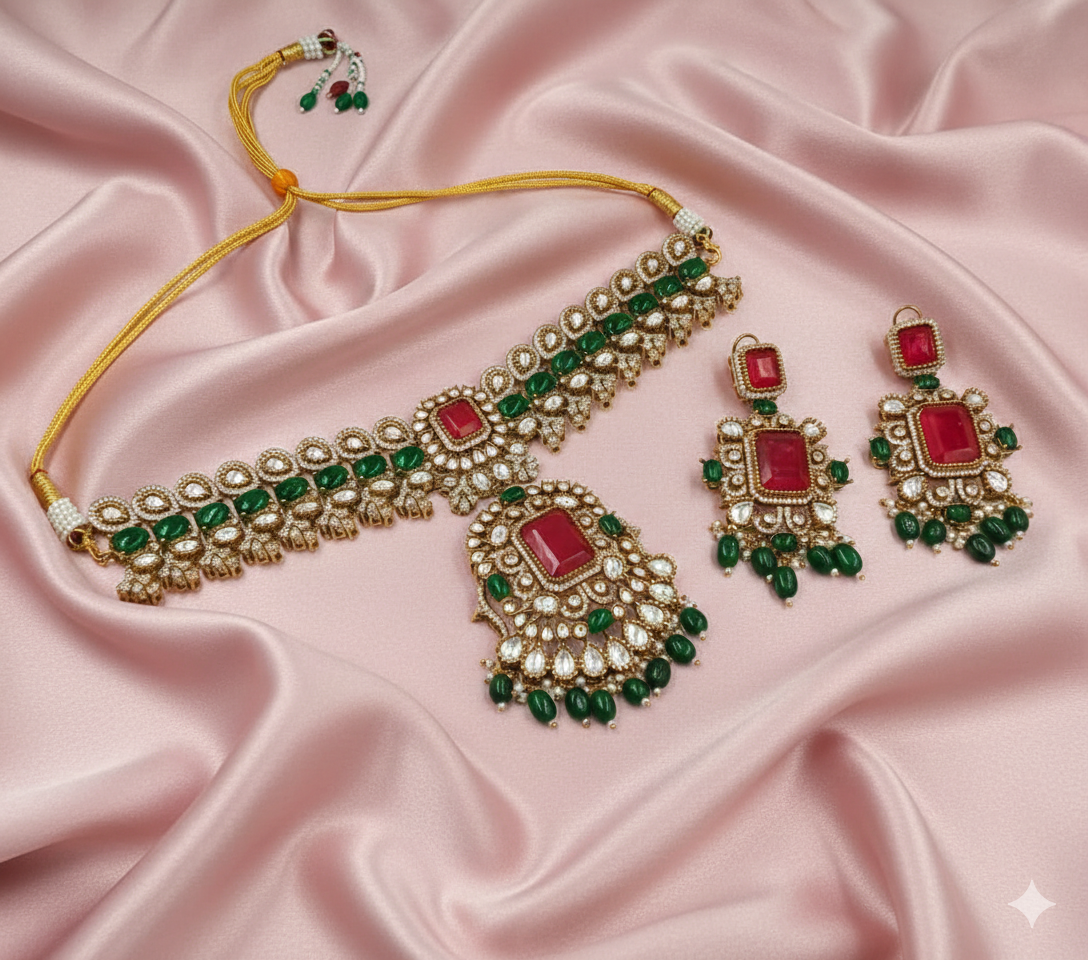 Elevate your ethnic ensemble with this exquisite piece designed for a blend of traditional craftsmanship and contemporary flair. The choker features a sequence of large, oval-cut purple stones boasting deep violet hues with natural-looking golden veins. Each stone is encased in a shimmering border of high-quality cubic zirconia, ensuring a brilliant sparkle from every angle.
