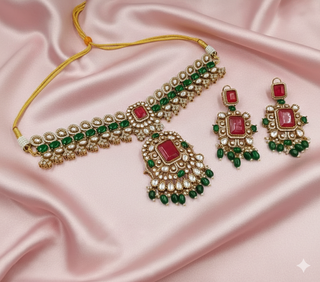 Elevate your ethnic wardrobe with the Amethyst Frost Choker. This set features oval-cut marbled stones in a deep purple hue with golden veins. Each stone is encased in a shimmering border of micro-pave crystals. The design is elegantly finished with a row of uniform white pearls, offering a blend of traditional craftsmanship and modern flair.