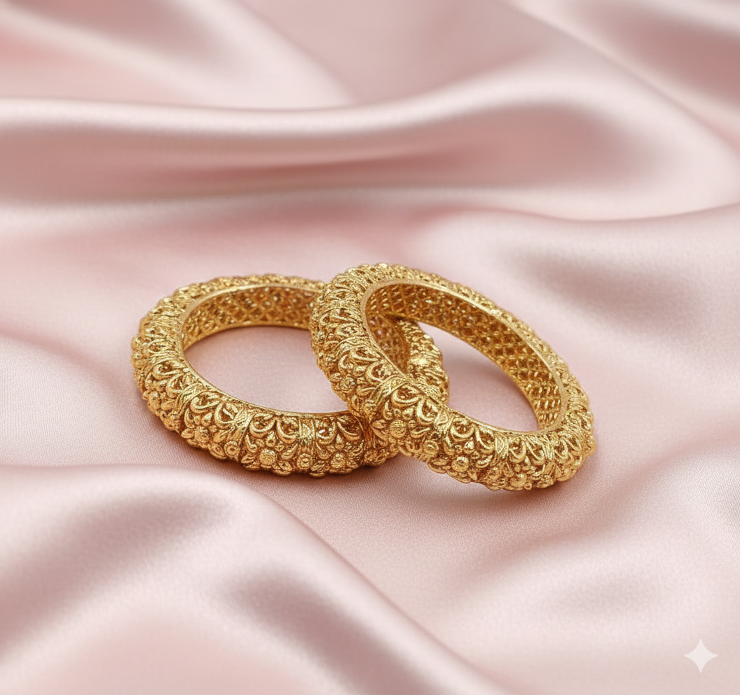 These Antique Gold Floral Bangles are beautifully crafted with an ornate traditional design that reflects timeless Indian artistry. Finished in a rich antique gold color, the bangles feature detailed floral and vine motifs on the outer surface, while the inner side has a fine lattice pattern for a refined finish and comfortable wear.