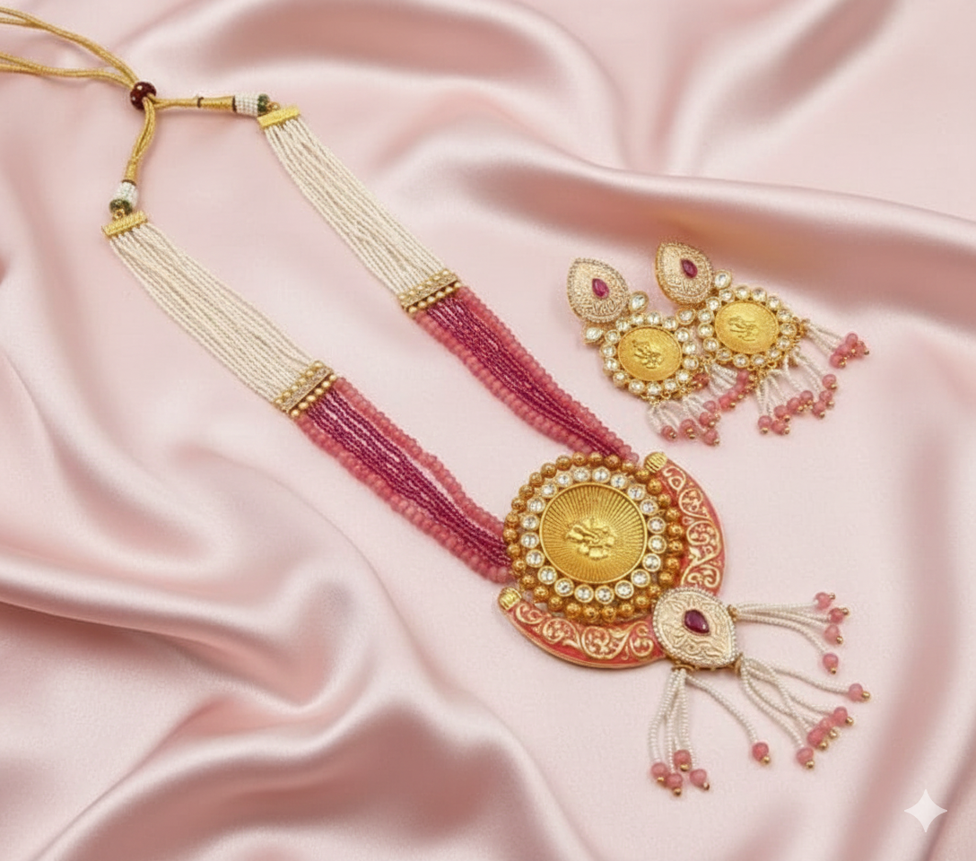 Enhance your traditional look with this beautifully handcrafted Antique Gold Temple Long Necklace Set, designed in a classic temple jewellery style. The necklace showcases multiple strands of cream/off-white pearls seamlessly blended with rich wine-pink beads, creating a graceful and luxurious colour combination.