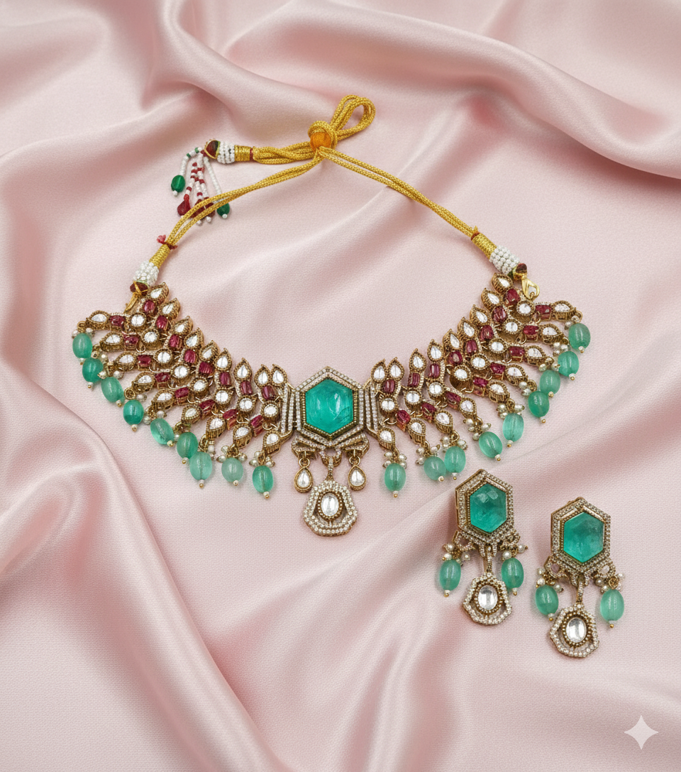 The Aqua Green Moissanite Choker Set is designed to showcase rich craftsmanship with an elegant, refreshing color palette. The centerpiece of this choker features a hexagon-cut aqua green stone (not emerald), bordered with high-shine moissanite stones that enhance its brilliance and clarity.