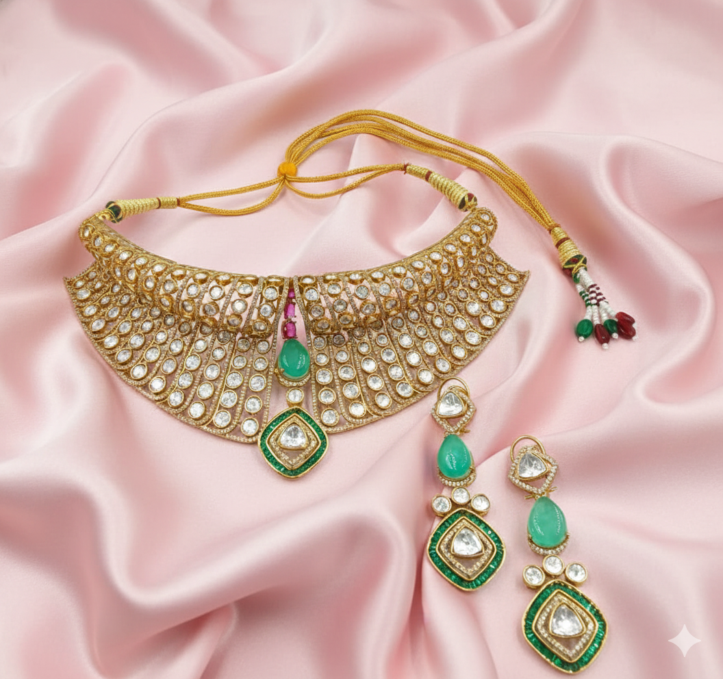 Finished with an adjustable golden dori, this choker ensures a comfortable and secure fit. Its structured hasli pattern makes it ideal for brides and festive wear lovers who prefer a bold yet elegant jewellery style.