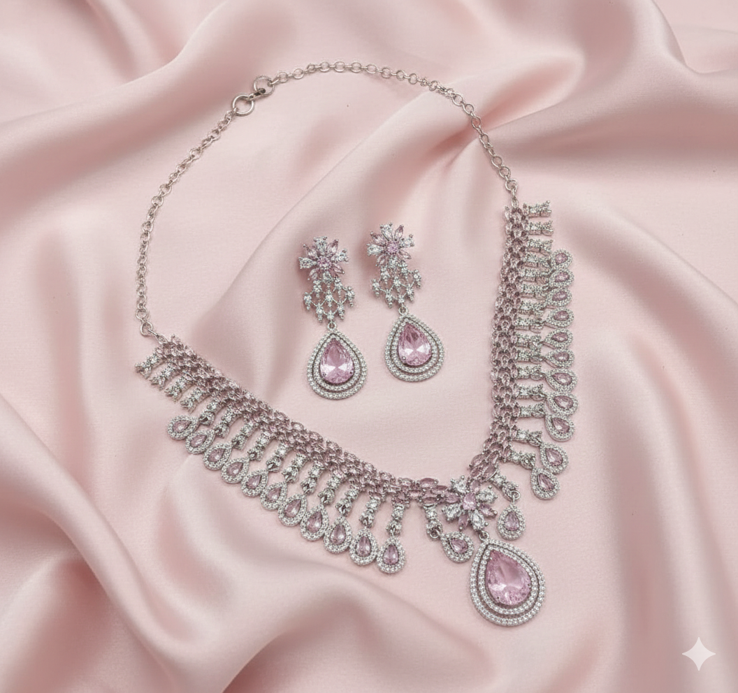 The necklace showcases a cascading design with delicately set pink drops that add fluid movement and brilliance, while the statement central pendant enhances its luxurious appeal. The matching earrings echo the same blush pink and crystal detailing, completing the set with perfect harmony.