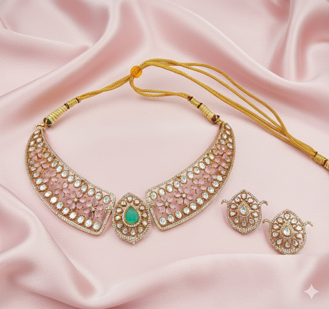 A graceful gold-tone moissanite necklace set adorned with soft blush-pink floral stones, sparkling white accents, and a refreshing green centre stone for an elegant festive look.