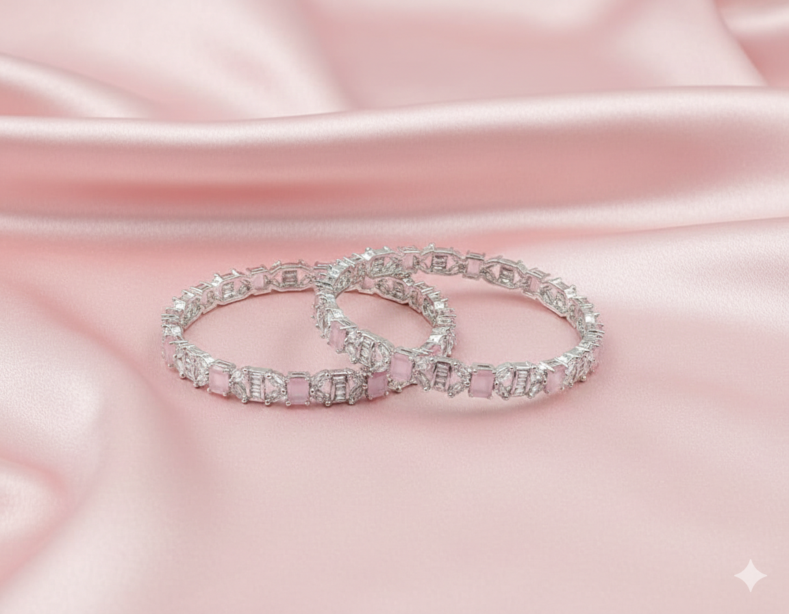 The Blush Pink AD Silver Bangle is a refined blend of elegance and modern charm. Crafted in a polished silver-tone finish, this bangle is beautifully set with delicate blush pink rectangular stones, paired with brilliant white AD (American Diamond) crystals that add subtle sparkle.