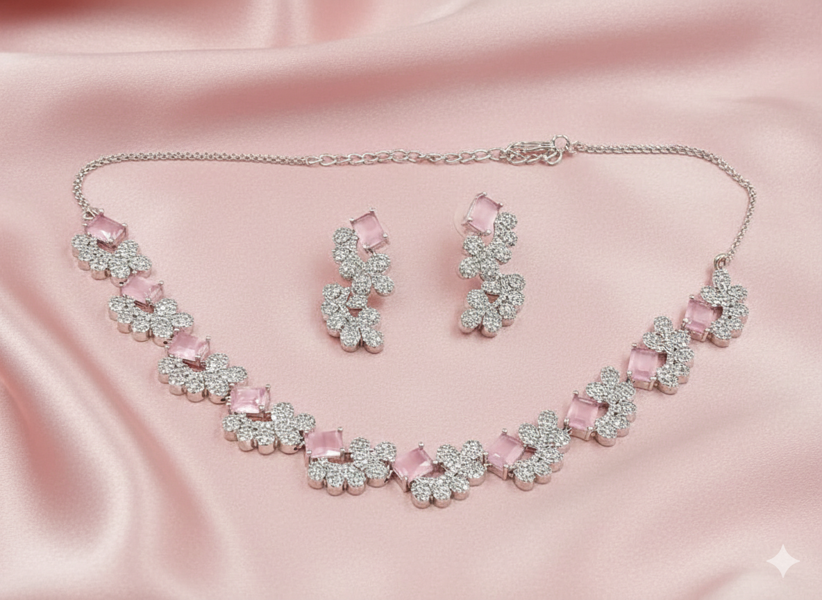 Blush Pink AD Silver Floral Necklace Set