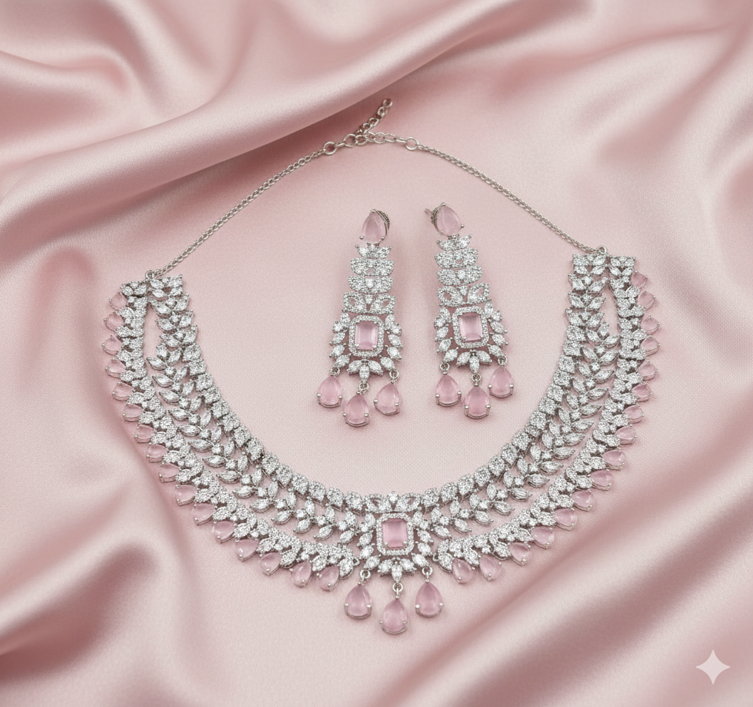 Finished with a high-quality silver-tone polish, this set offers lasting shine, comfort, and durability. Ideal for weddings, receptions, festive occasions, and elegant evening wear, the Blush Pink Elegance AD Necklace Set pairs beautifully with pastel, neutral, and traditional outfits, making it a timeless addition to any jewelry collection.