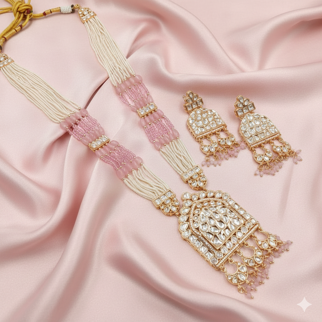 An elegant kundan long necklace set crafted with ivory pearl strands, soft blush pink beads, and antique gold kundan detailing, paired with matching earrings for a graceful festive look.