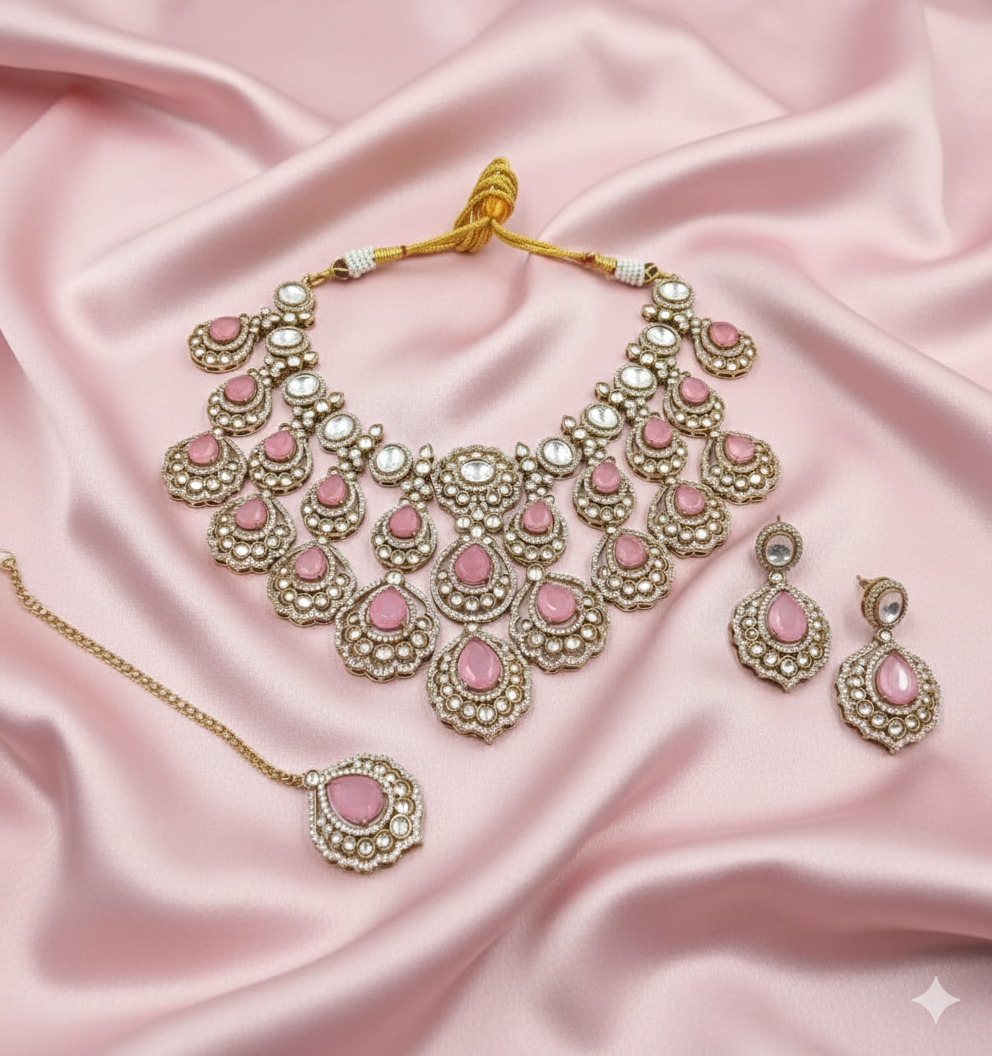 Elevate your bridal and festive look with this exquisite Blush Pink Moissanite Heavy Necklace Set, crafted to perfection in a rich antique gold finish. The necklace showcases beautifully arranged soft blush-pink teardrop stones, each framed by shimmering clear moissanite-style crystals that add a luxurious glow.