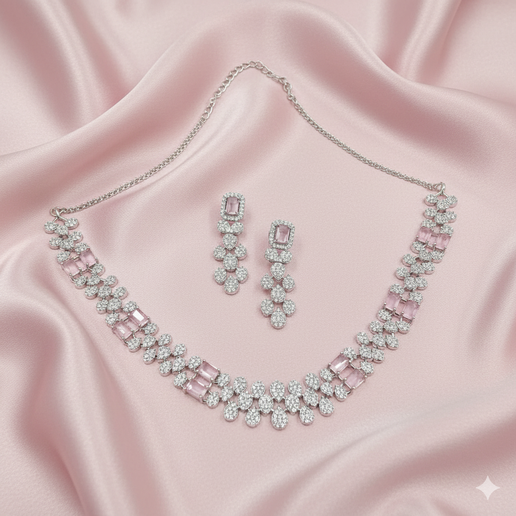 A graceful AD necklace set featuring exact blush pink (light baby pink) stones paired with sparkling white AD stones in a sleek silver finish, with matching earrings.