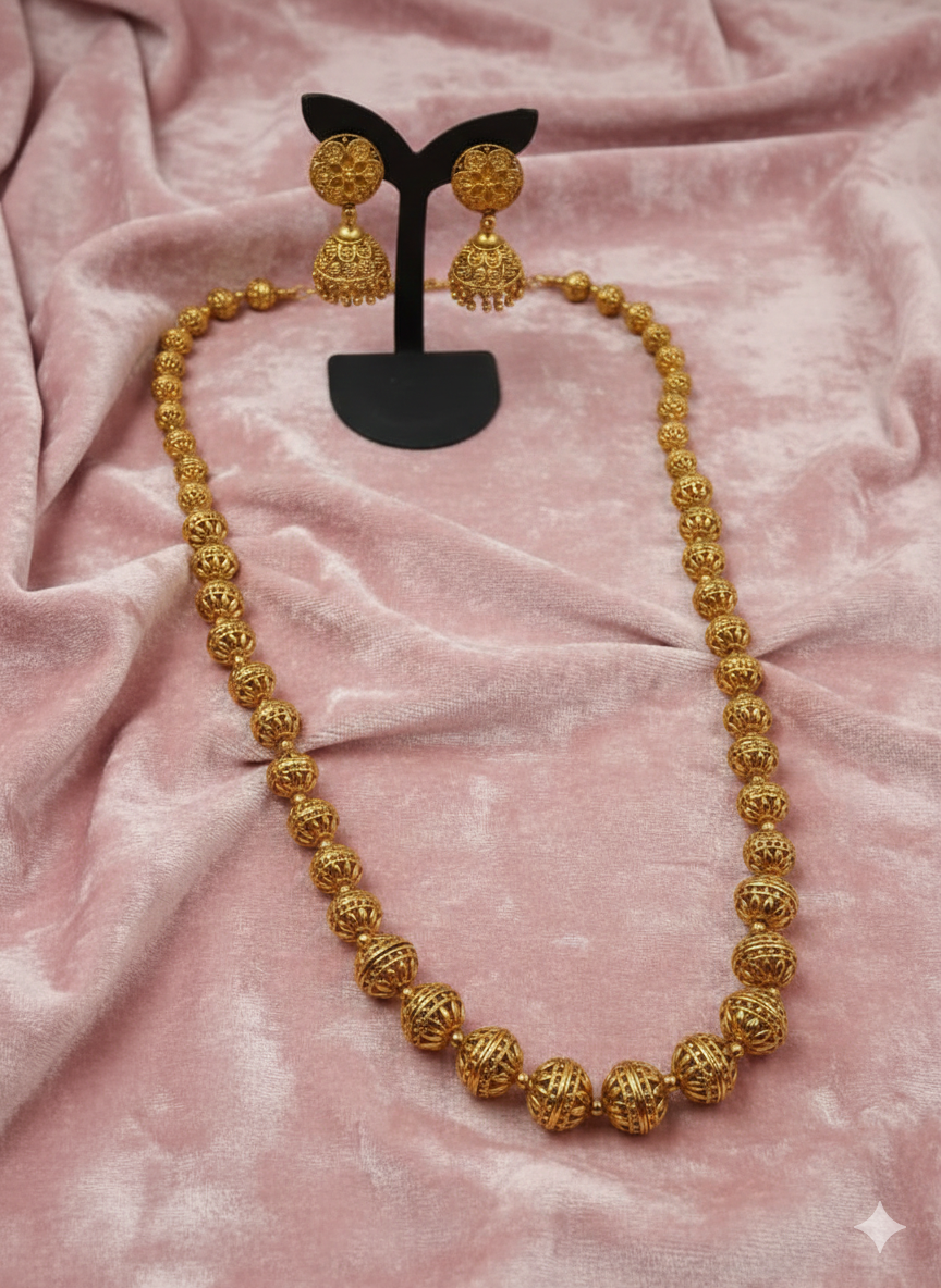 A timeless Indian traditional necklace featuring intricately textured gold-plated “Matar” beads and matching Jhumka earrings.