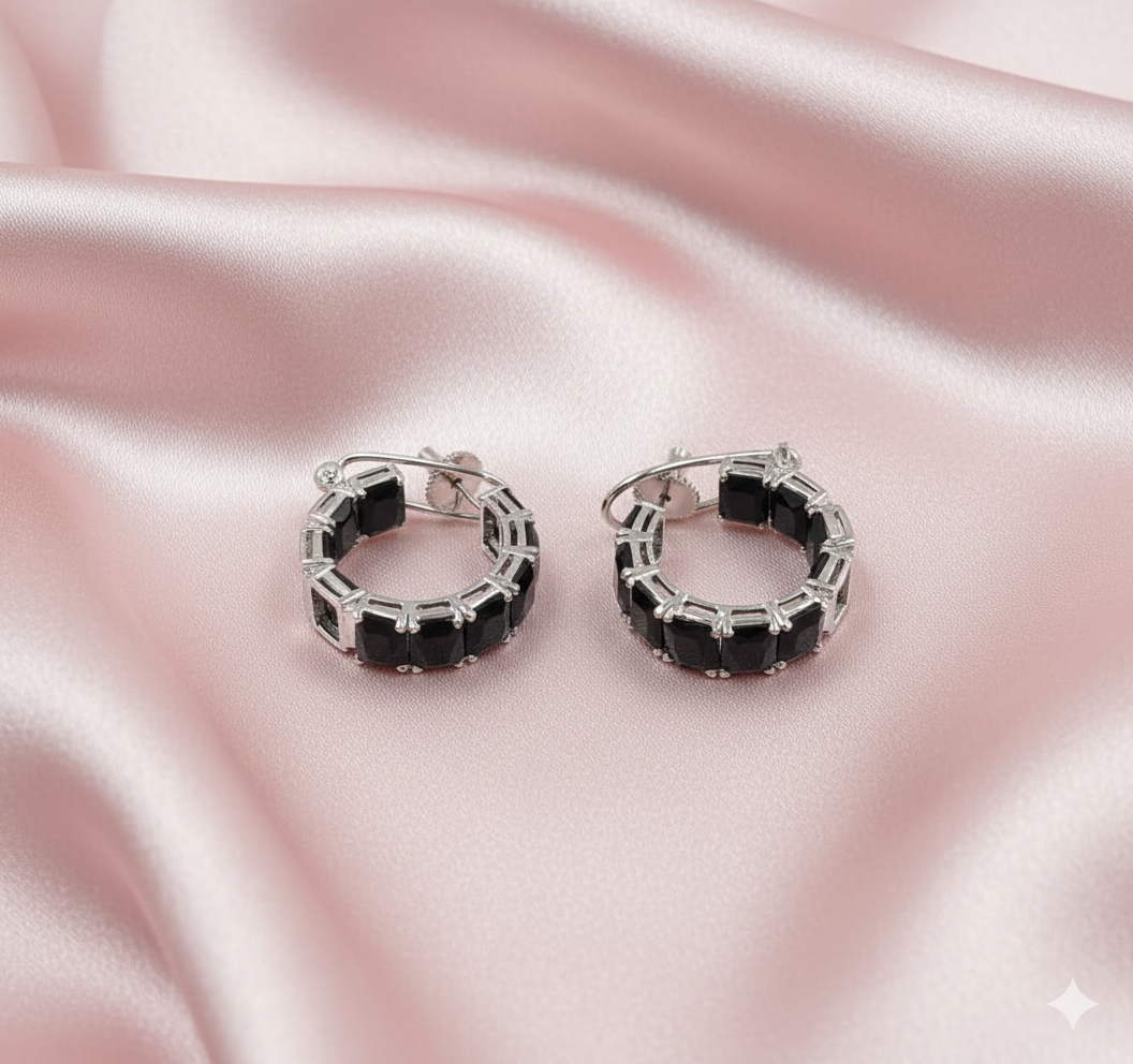 Add effortless elegance to your jewellery collection with our Classic Black AD Bali Earrings. Designed in a traditional bali hoop style, these earrings are set with deep black rectangular AD stones, giving them a powerful yet classy appeal. The high-quality silver polish enhances the contrast, making the black stones stand out beautifully.