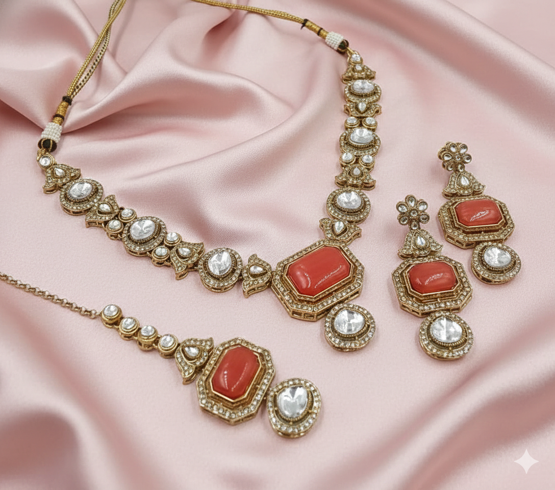 The warm exact coral red colour adds depth and richness to the design, making it a standout piece for weddings, festive celebrations, and cultural occasions. The necklace is finished with a comfortable adjustable thread closure, ensuring a perfect fit, while the matching earrings echo the same coral red and moissanite detailing for a complete, graceful look.