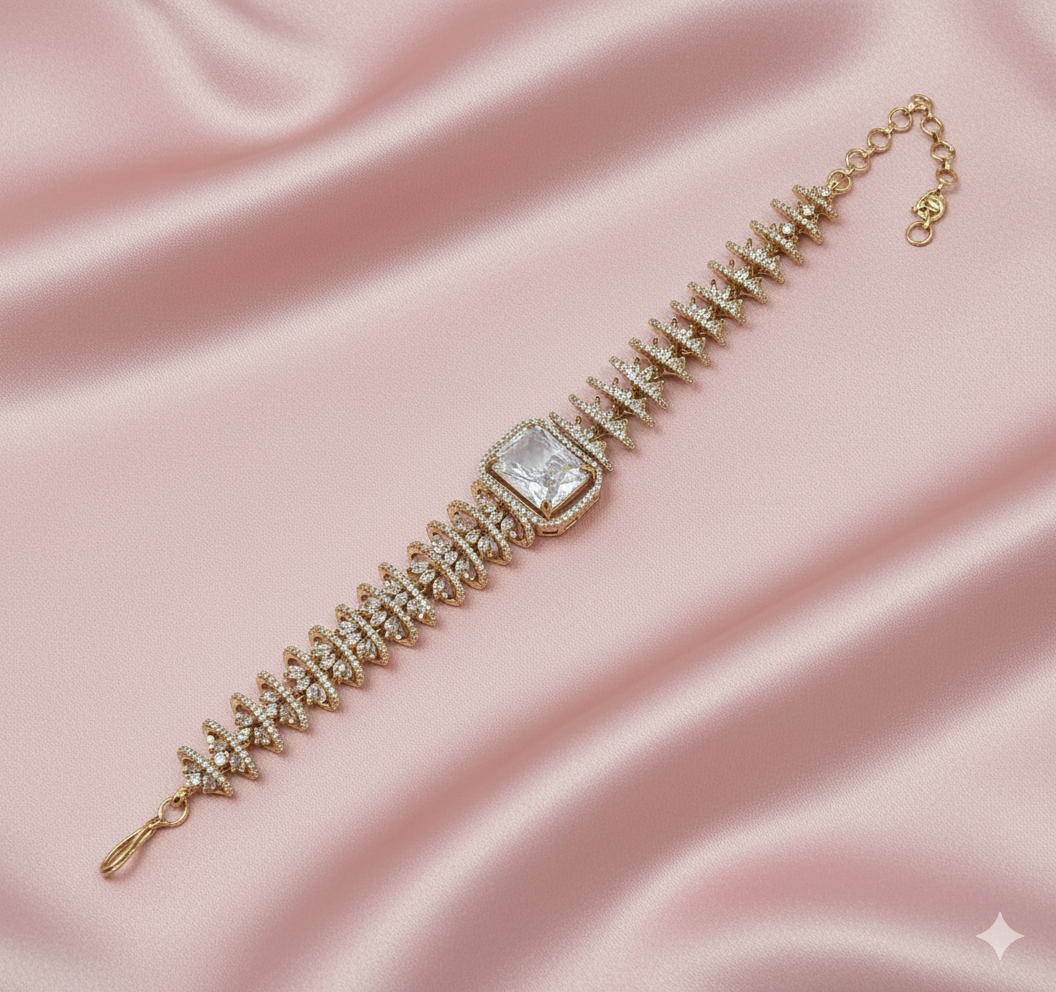 Ideal for weddings, festive functions, parties, and everyday ethnic wear, this bracelet pairs seamlessly with sarees, lehengas, and contemporary fusion outfits. The timeless combination of gold and clear white sparkle makes it a versatile accessory, adding grace and brilliance to both daytime and evening looks.