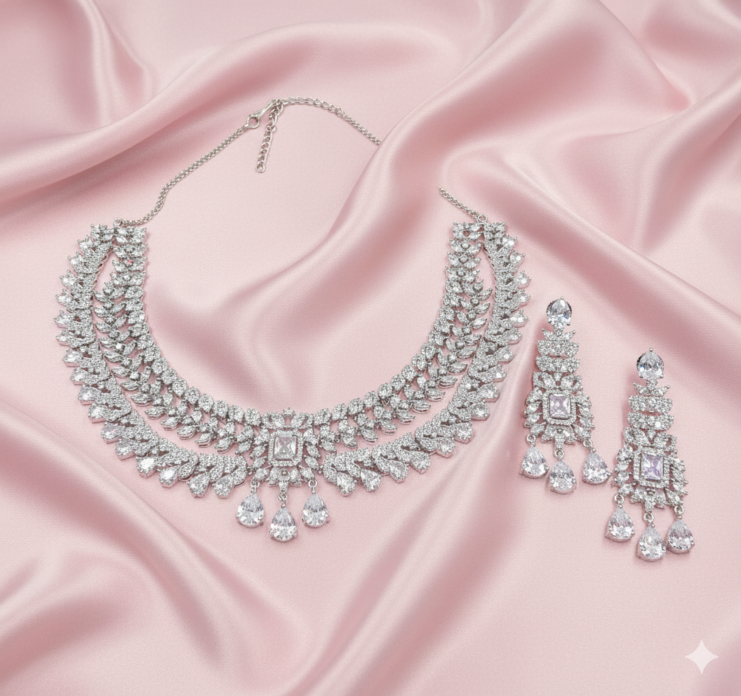 Finished in a premium silver-tone polish, this set offers exceptional shine, durability, and comfort. Ideal for weddings, bridal wear, receptions, parties, and formal occasions, the Diamond White Radiance AD Necklace Set pairs effortlessly with all outfit colors, making it a versatile and timeless addition to any jewelry collection.