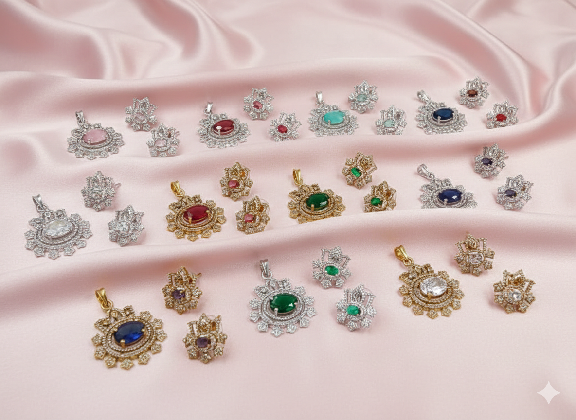 Graceful floral-inspired AD pendant sets featuring sparkling stones in multiple colour options with matching earrings.
