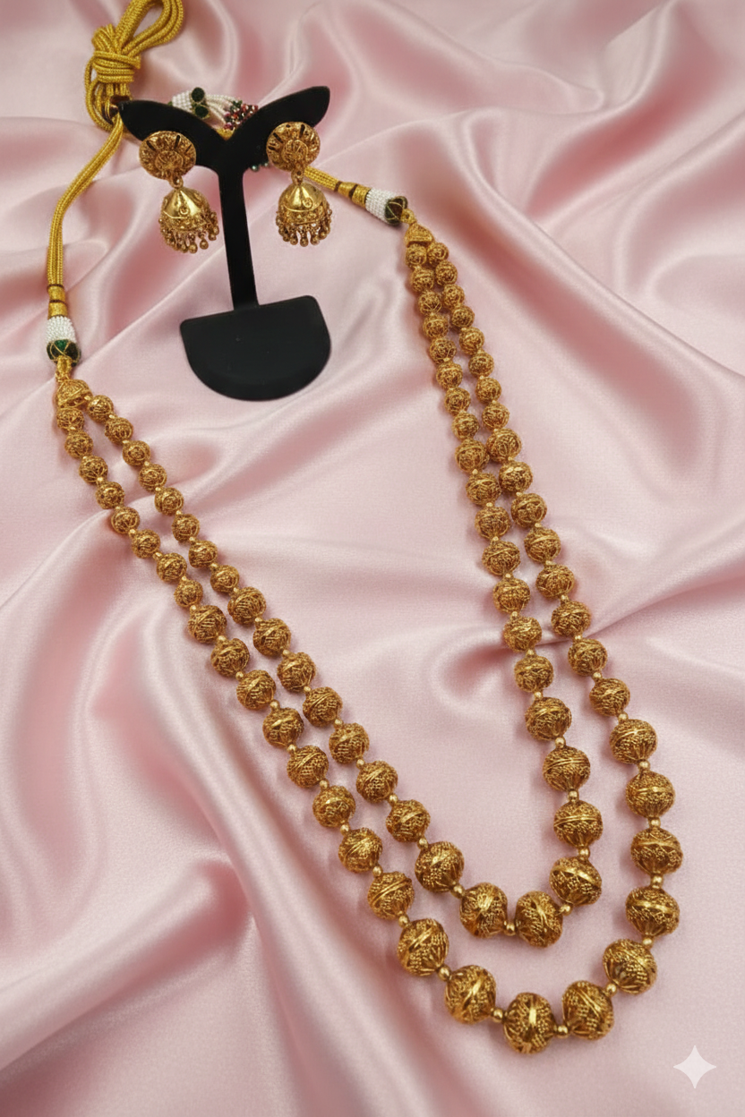 Elevate your elegance with this stunning Floral Vine AD Set. The necklace features a graceful, interlocking vine motif crafted with high-quality American Diamonds that capture light from every angle. Set on a polished gold-plated base, the design transitions into matching floral-drop earrings, making it the perfect accessory for weddings, festive occasions, or formal dinners.