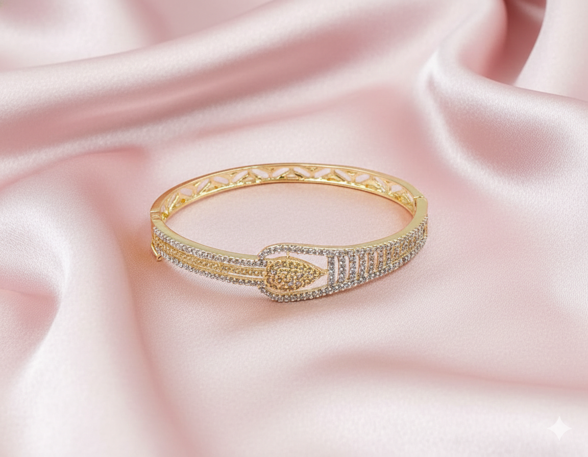 Exquisitely crafted, this belt-inspired AD bracelet merges contemporary fashion with traditional luxury. The high-polish yellow gold finish serves as the perfect backdrop for rows of meticulously set American Diamonds that wrap around the wrist. The centerpiece features a distinctive pointed buckle design, adding a modern twist to the classic kada. Lightweight yet substantial in appearance, this bracelet includes a secure side clasp for easy wear. It is an ideal statement piece for weddings, parties, or high-profile events.