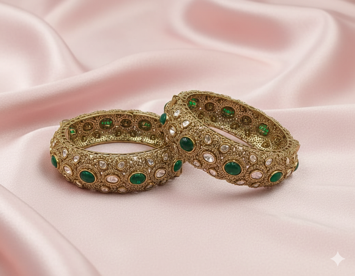 The Emerald Green Moissanite Antique Gold Bangle is a timeless expression of heritage luxury. Designed in a warm antique gold tone, this bangle features dazzling white moissanite stones beautifully set alongside bold emerald green oval stones, creating a striking contrast that enhances its royal charm.