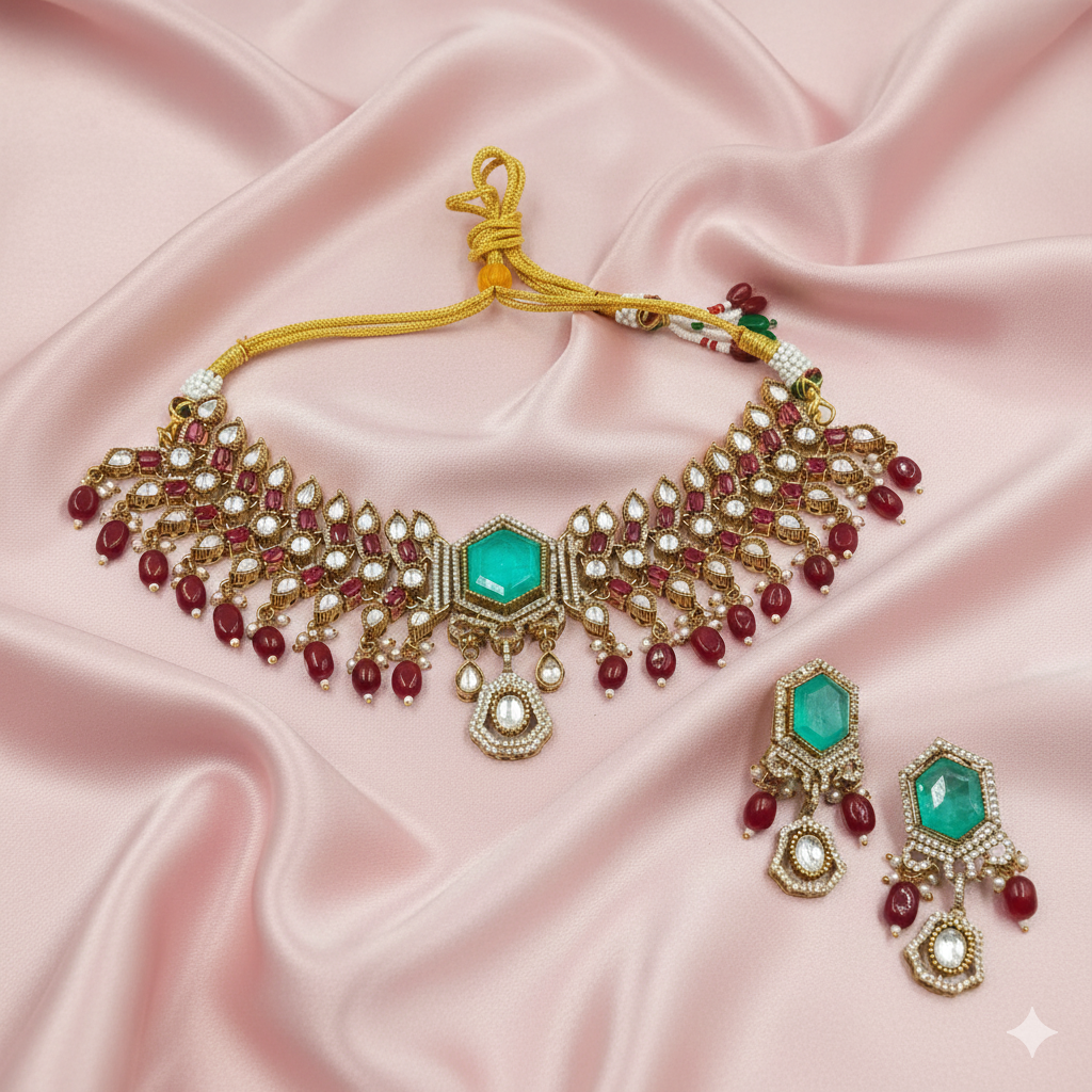 The matching earrings echo the same emerald green centre stones, moissanite detailing, and ruby red drops, creating a perfectly coordinated look. Ideal for weddings, receptions, bridal wear, and grand festive occasions, this choker set is designed to make a luxurious statement.