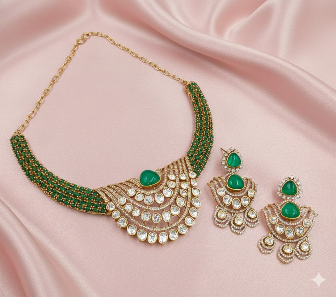 Make a regal statement with this exquisitely designed Moissanite Hasli Necklace Set, crafted for timeless elegance and royal appeal. The design features rich emerald green oval cabochon stones, beautifully contrasted with layers of sparkling white moissanite stones that add brilliance and depth to the necklace.