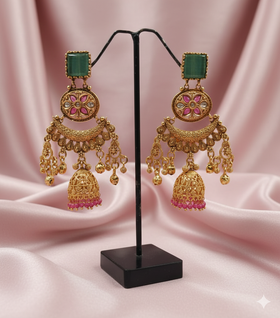 Below, intricately carved antique gold crescent elements with hanging charms flow into a classic jhumki, finished with rani pink bead drops that add graceful movement and festive vibrance. The antique gold tone enhances the richness of the green and pink colour combination, creating a timeless and elegant appeal.