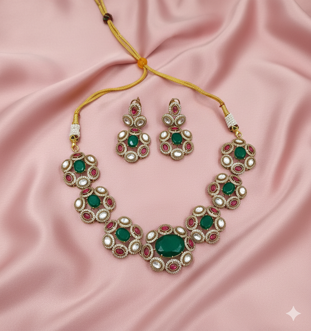 Indulge in the grandeur of traditional craftsmanship with our Emerald Green & Ruby Red Moissanite Necklace Set. Designed for the modern woman who appreciates vintage charm, this set captures the essence of royal heritage jewelry.