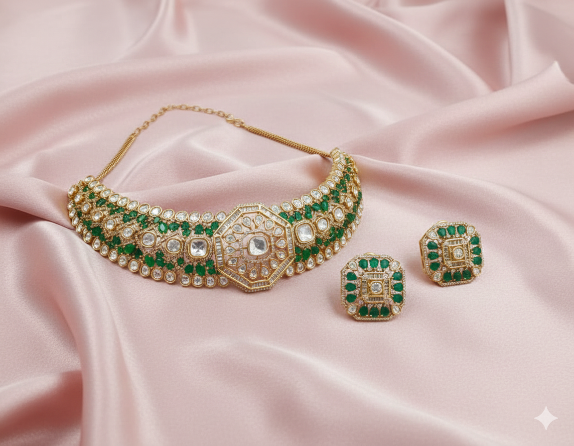 The matching stud earrings mirror the same geometric pattern, framed with emerald green stones and finished with radiant moissanite detailing for a perfectly coordinated ensemble. Ideal for weddings, bridal occasions, and grand celebrations, this choker set is designed to make a bold and timeless statement.