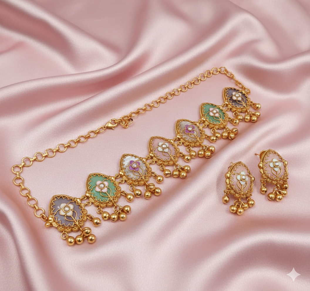 Celebrate royal splendor with this architectural masterpiece. The wide silver-pave band is studded with vibrant emerald-green and ruby-toned gems, surrounded by a kaleidoscope of smaller multi-colored stones. The centerpiece is a magnificent, three-tiered grand pendant that adds incredible drama to the neckline, paired with matching tiered geometric earrings.