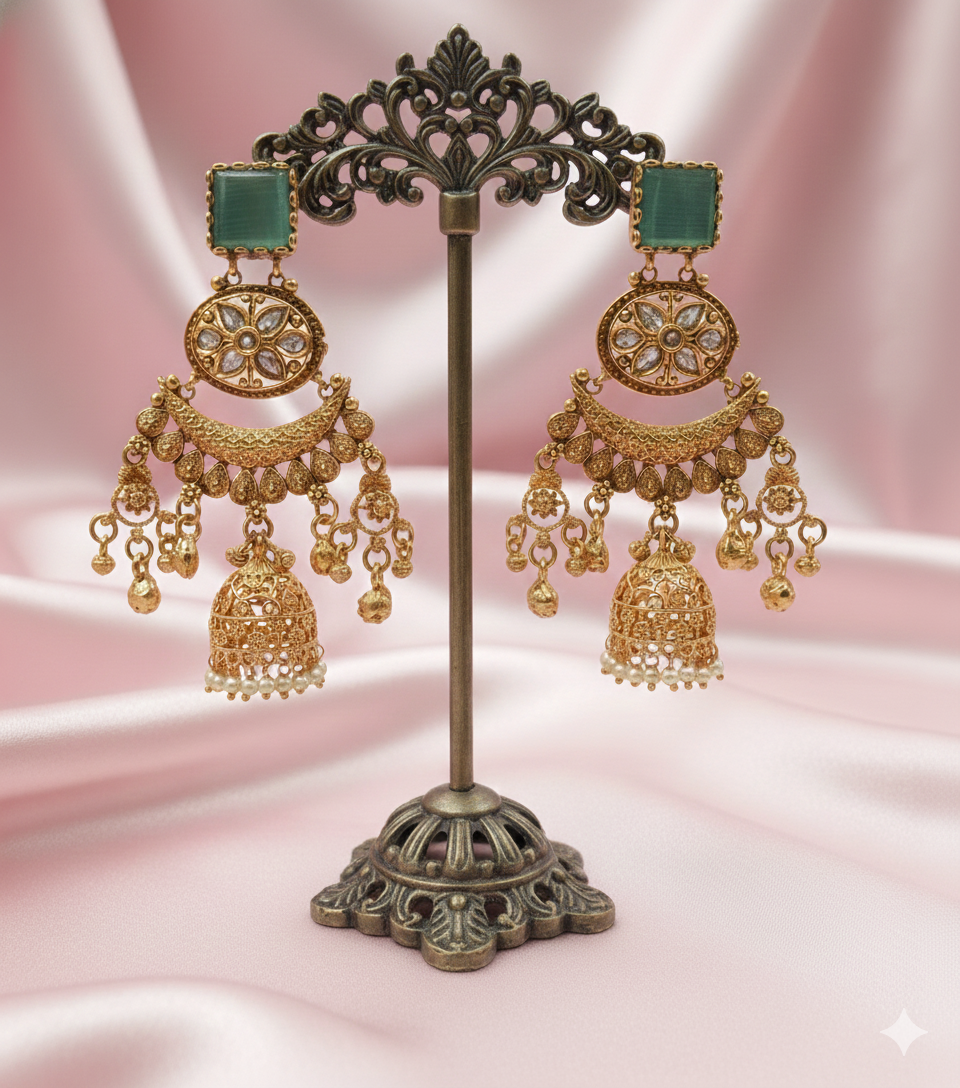 Intricately carved antique gold crescent elements with dangling charms lead to a beautifully crafted jhumki, finished with emerald green bead drops that add graceful movement and festive charm. The antique gold finish enhances the depth of the green hues, creating a regal and heritage-inspired look.