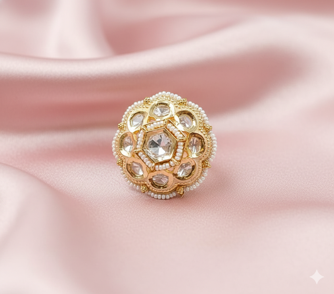 Command attention with the ultimate piece of bridal luxury. This oversized statement ring features multiple tiers of teardrop and circular-cut clear stones, creating a massive floral medallion. The centerpiece is available in sophisticated monochromatic clear stones or highlighted by vibrant emerald or ruby accents, all set within a heavily textured gold-plated frame for a regal, high-fashion look.