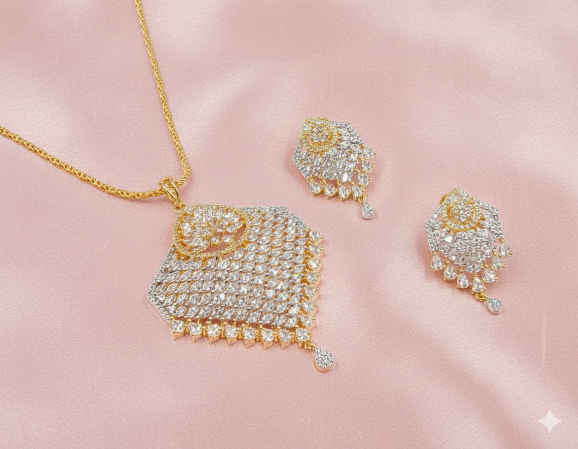 Command attention with this grandiose heritage set. The focal point is a large, ornate emerald-green pendant decorated with gold floral vines and hand-set Kundan stones. The necklace features extensive multi-strand ivory pearl work punctuated by ruby-pink and green bead sections. Finished with oversized ruby-colored smooth drops and matching chandelier-style earrings, this set offers a high-luxury aesthetic for any special heritage celebration