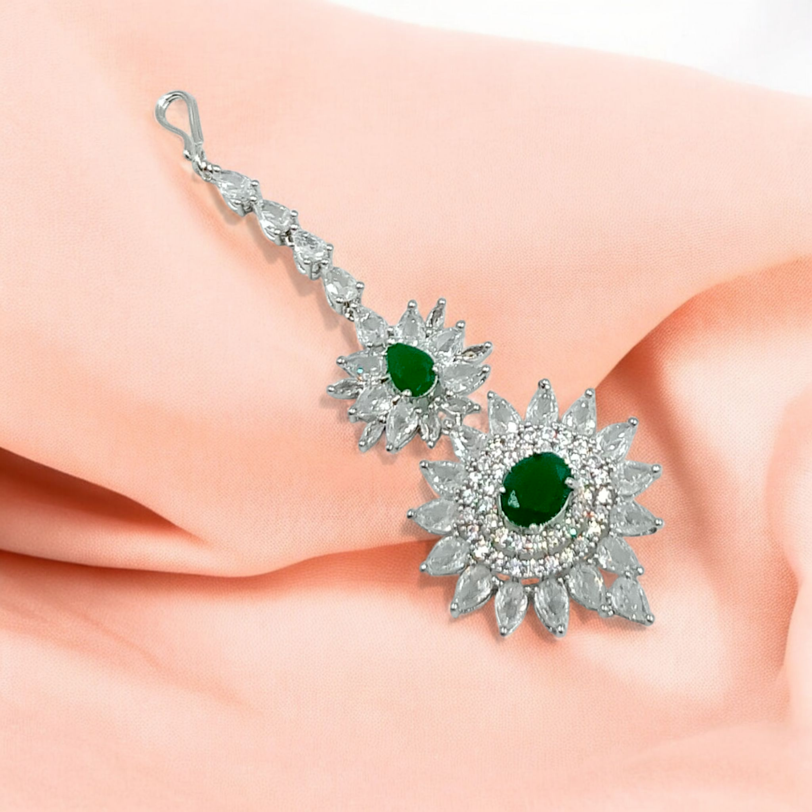 Crafted with premium AD stones in a vibrant green hue, this maang tikka brings elegance and sophistication to any festive or bridal outfit.