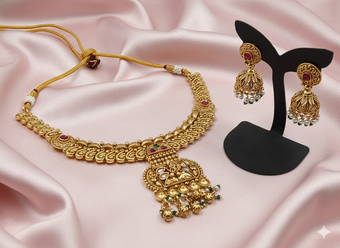 Exquisitely crafted for the modern queen, our Multi-Stone Heritage Set merges traditional artistry with contemporary luxury. The necklace features a heavy gold-toned base adorned with a stunning variety of colored gemstones and brilliant AD accents that catch the light from every angle. The tiered drop design adds significant volume and elegance, making it a showstopper for any ethnic wardrobe. This set includes a secure adjustable chain and matching statement earrings to ensure a perfect, regal fit.
