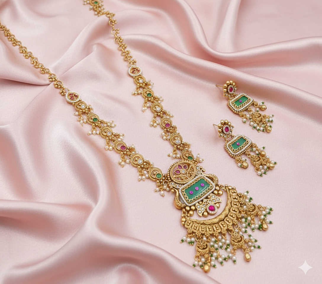 Exquisitely crafted for the modern queen, our Multi-Stone Heritage Set merges traditional artistry with contemporary luxury. The necklace features a heavy gold-toned base adorned with a stunning variety of colored gemstones and brilliant AD accents that catch the light from every angle. The tiered drop design adds significant volume and elegance, making it a showstopper for any ethnic wardrobe. This set includes a secure adjustable chain and matching statement earrings to ensure a perfect, regal fit.