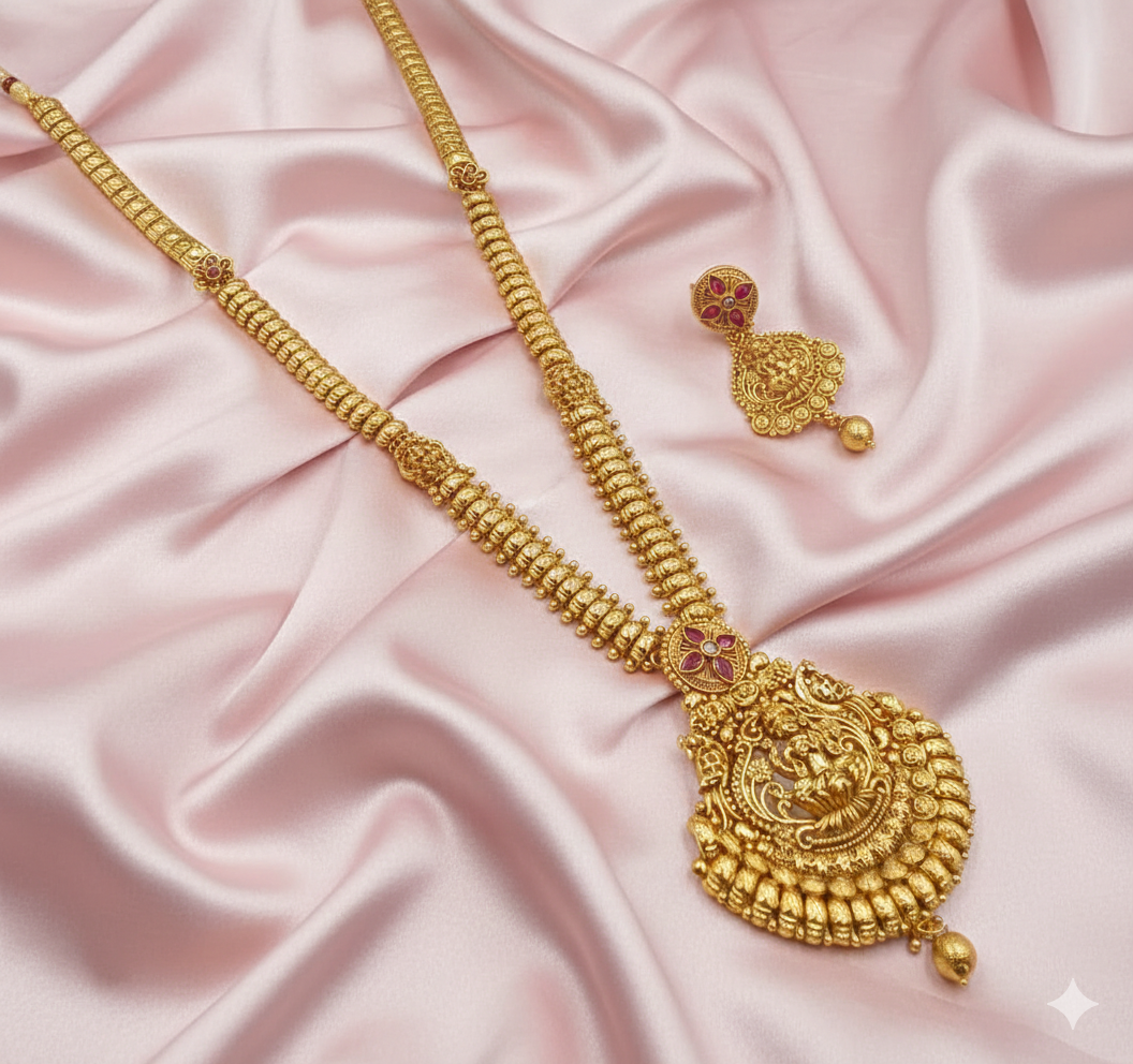 Exquisitely crafted for the modern queen, our Radha Krishna Heritage Set merges sacred artistry with contemporary luxury. The necklace features a heavy gold-toned base adorned with detailed iconography and brilliant stone accents that catch the light from every angle. The tiered drop design and hanging golden beads add significant volume and elegance, making it a showstopper for any ethnic wardrobe. This set includes a secure adjustable cord and matching statement earrings to ensure a perfect, regal fit for your most special events.