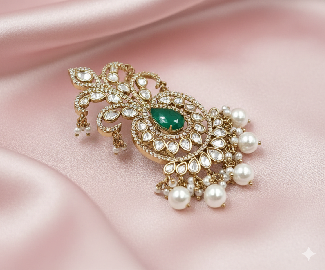 Handcrafted gold-plated Moissanite Polki earrings featuring a traditional “Chandbali” silhouette with vibrant gemstone accents.