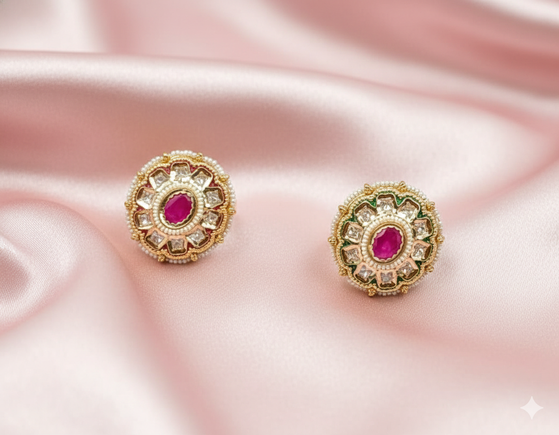 Command attention with the ultimate in bridal luxury. This oversized statement piece features multiple tiers of teardrop and circular-cut clear stones, creating a massive floral medallion. The center is available in a sophisticated monochromatic clear stone or highlighted by vibrant emerald or ruby accents, all set within a heavily textured gold-plated frame for a regal, high-fashion look.