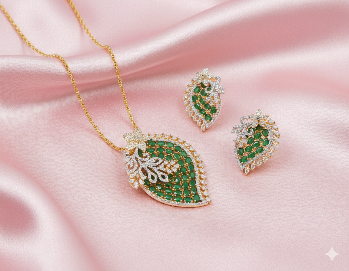 Experience the pinnacle of luxury with our signature pendant ensembles, where traditional craftsmanship meets modern brilliance. Each piece features a striking centerpiece—available in rich emerald green or vibrant ruby pink—cradled by a meticulous lattice of shimmering American Diamonds. Finished with premium gold plating, these sets include matching earrings to ensure a perfectly coordinated, regal look. Whether for weddings or festive galas, these designs capture light and attention from every angle.
