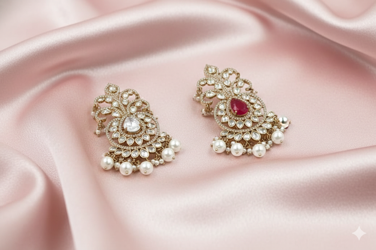 These premium “Kalki” edition earrings are designed for a truly royal look. The intricate gold-plated framework is adorned with shimmering Moissanite Polki stones, leading to a vibrant pear-cut center. The base is finished with a rich cluster of pearls, making them a perfect statement piece for bridal and festive wear.