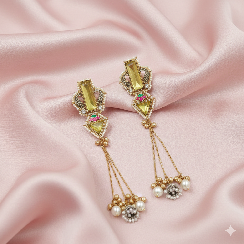 The design is enhanced with delicate kundan highlights and subtle enamel detailing, while graceful chain tassels finished with gold beads and ivory-tone pearls create beautiful movement. The elongated drop silhouette flatters the neckline, making these earrings an ideal choice for haldi functions, festive celebrations, weddings, and traditional occasions.