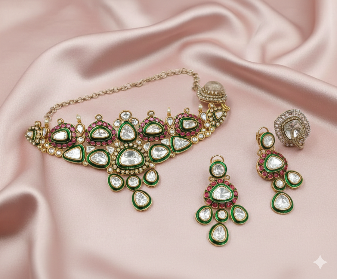 This heritage-style choker set pays homage to traditional royal craftsmanship. The necklace features high-quality clear stones set into a rich, antique gold-finished base, separated by exquisite floral engraving work. Paired with statement jhumka earrings, this set is ideal for bridal or high-profile festive wear.