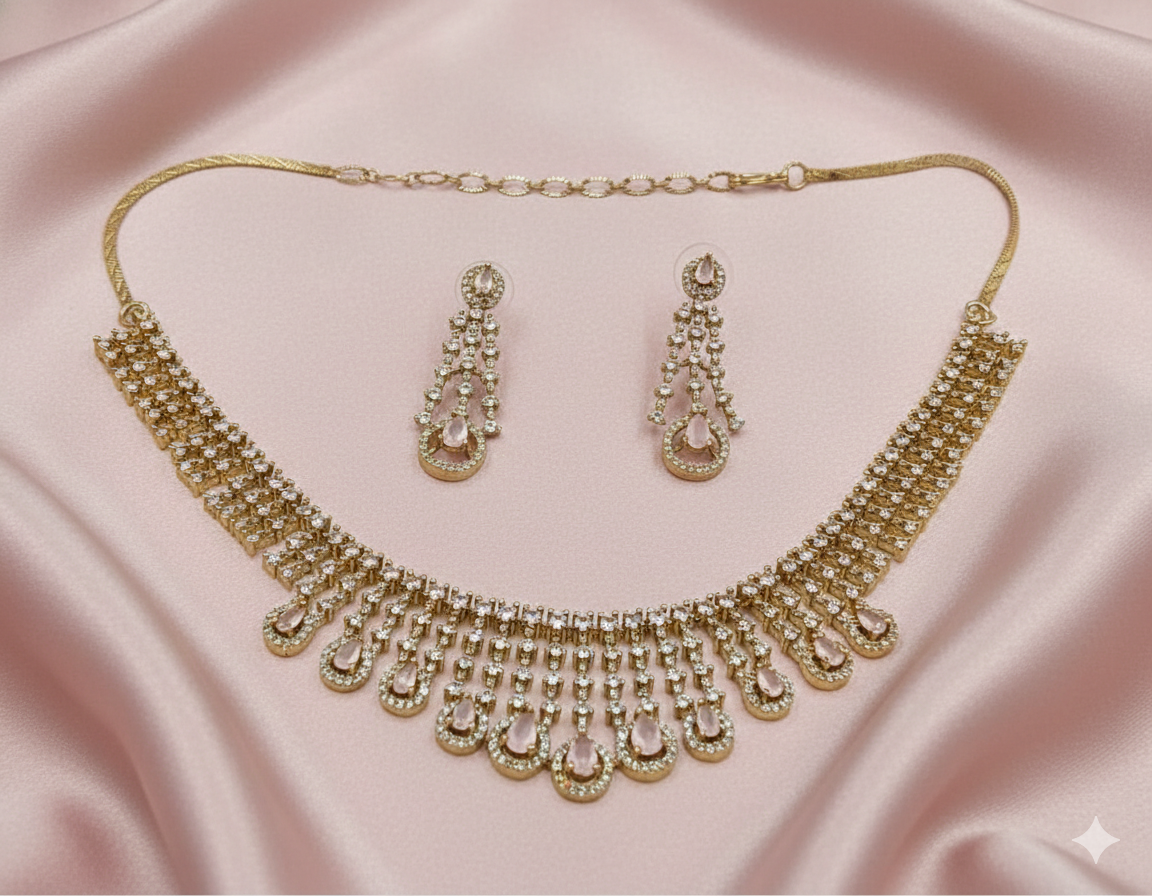 Elevate your ethnic ensemble with this exquisite Kundan Meenakari set. The centerpiece is a striking teardrop-shaped pendant adorned with rich green enamel and hand-set Kundan stones. The necklace is meticulously crafted with five strands, alternating between dainty ivory seed pearls and translucent emerald-green faceted beads. Accompanied by matching Jhumka-style drop earrings, this set is an ideal statement piece for weddings.