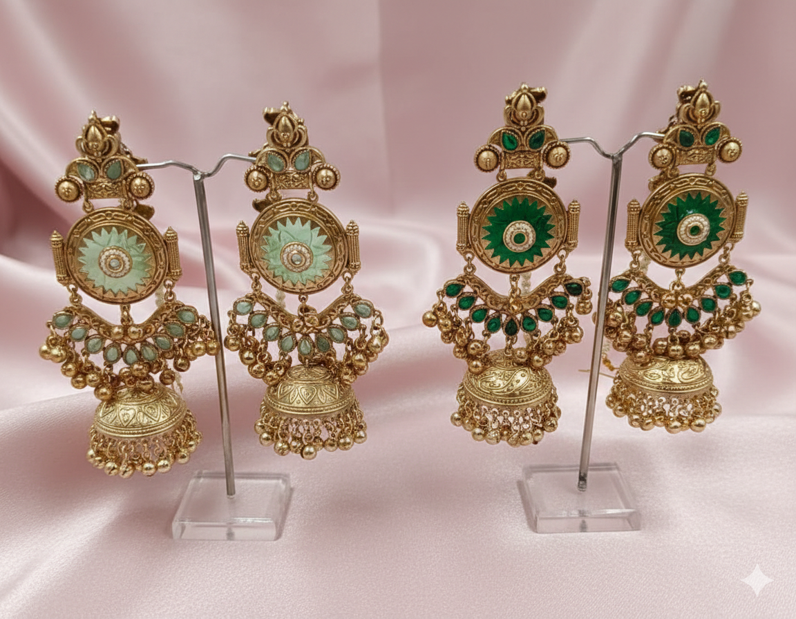 Embrace royal elegance with our Maharani Tiered Jhumkas. These statement earrings offer a premium “Silver Look-Alike” finish with an ornate, elongated silhouette. The design begins with a bold, circular stud framed by delicate white seed pearls and descends through multiple tiers of golden charms and colorful stone accents. Finished with a meticulously carved Jhumka dome and a voluminous fringe of pristine pearls, these earrings are the ultimate accessory for weddings and grand festivities