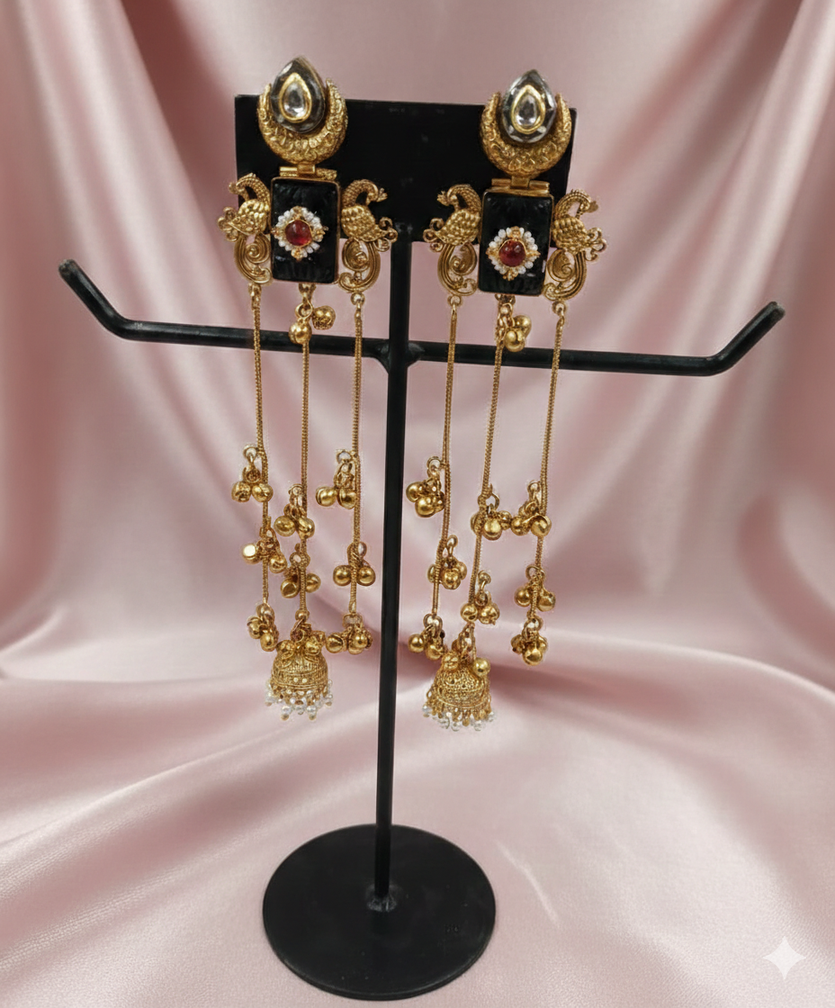 Elevate your festive ensemble with the Maharani Tiered Jhumkas. These earrings showcase an elongated, cascading silhouette that captures the essence of traditional Indian heritage. The design begins with a large, pearl-bordered circular stud and descends through multiple layers of golden charms and ruby-toned accents. The piece concludes with a meticulously carved Jhumka dome and a rich fringe of white seed pearls, making it a high-impact accessory for weddings and grand celebrations.