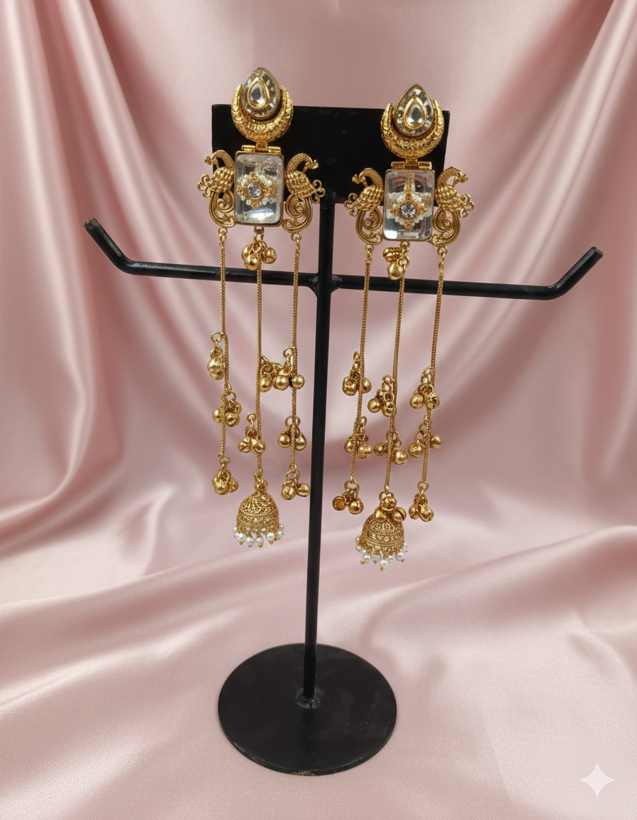 Embrace royal elegance with the Maharani Tiered Jhumkas. These statement earrings feature a cascading multi-layered design that perfectly blends traditional craftsmanship with a grand silhouette. The design begins with a large, pearl-bordered circular stud and descends through multiple tiers of golden charms and colorful stone accents. Finished with a meticulously carved Jhumka dome and a rich fringe of white seed pearls, these earrings are the ultimate accessory for grand festivities.