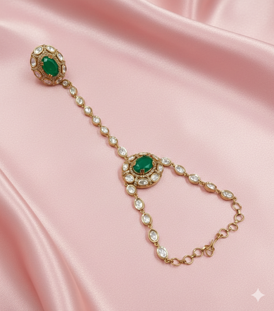 Embrace the grandeur of traditional Indian jewelry with this exquisite Moissanite Hathfull (Hand Harness). This piece features a striking rectangular statement ring and a delicate oval center focal point, both encrusted with high-quality, brilliant-cut moissanite stones. The hand harness is connected by a series of circular bezel-set stones, leading to a refined wrist chain that ensures a perfect, shimmering drape across the back of the hand. Finished in a sophisticated antique gold tone, this accessory is the perfect companion for bridal wear, grand festivities, or any occasion where you want to make a statement of elegance.